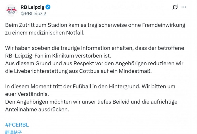 莱比锡俱乐部确认,一名莱比锡球迷进入球场时发生紧急医疗情况(与外部因素无关),被送往医院,最终在医院去世,莱比锡俱乐部社媒因此将这场比赛的直播报道减少到最低限度,并向家属表示深切慰问。